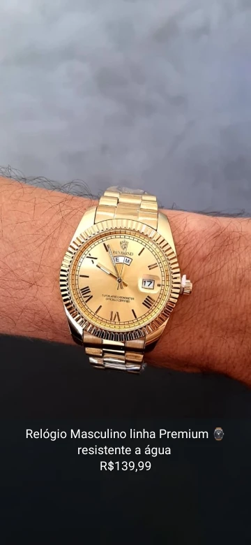 o relógio é bem imponente a pulseira dele é uma pulseira que é pesadinha o relógio em si ele é pesadinho é os ponteiros muito bonito o fundo dele é um relógio assim bem clássico o botão regular a data é um relógio que na descrição diz que ele é resistente à água compraria novamente