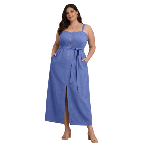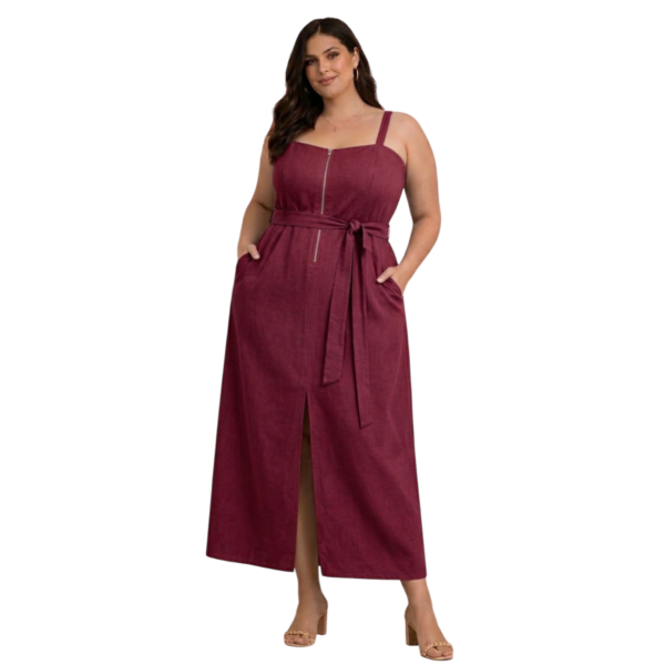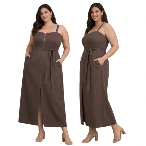 Cintura Marcada: Acompanha uma faixa removível que define a silhueta, permitindo diferentes formas de amarração.